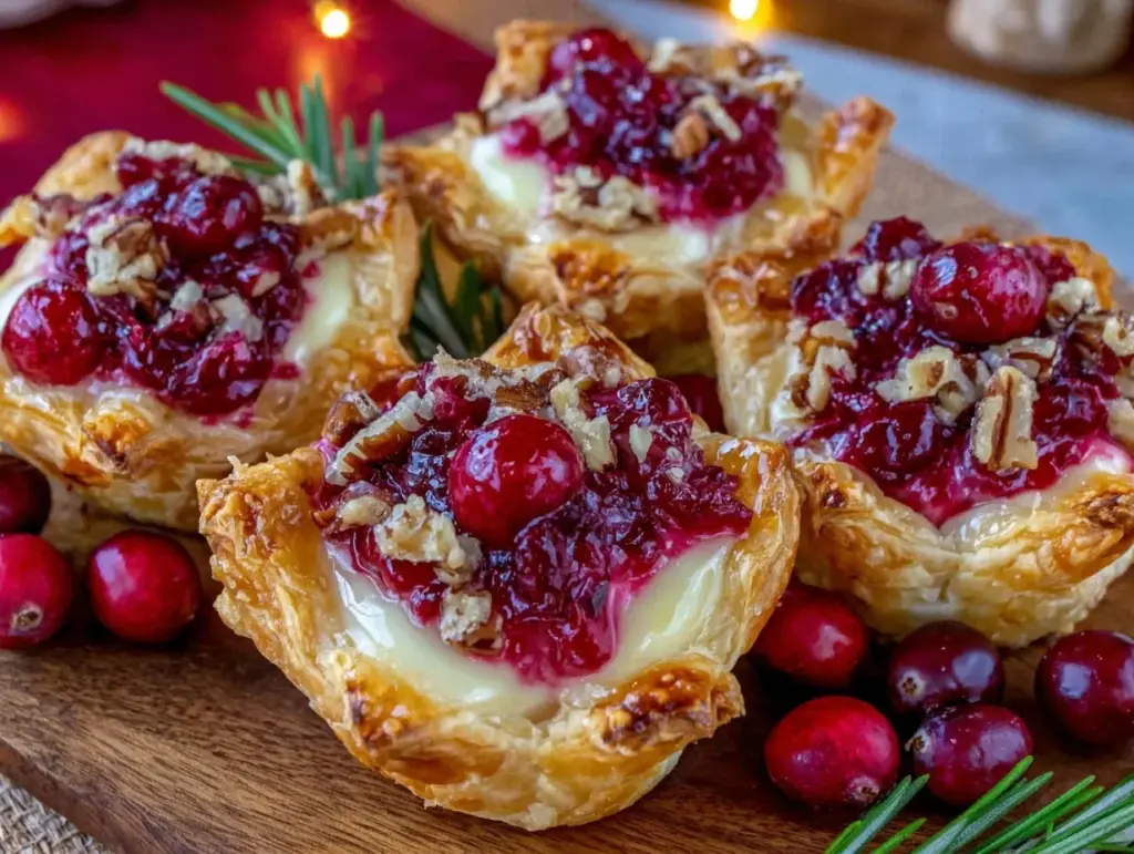 These crispy cranberry brie bites combine flaky puff pastry with creamy brie and tangy cranberry sauce for an easy, crowd-pleasing appetizer perfect for holidays and parties.
