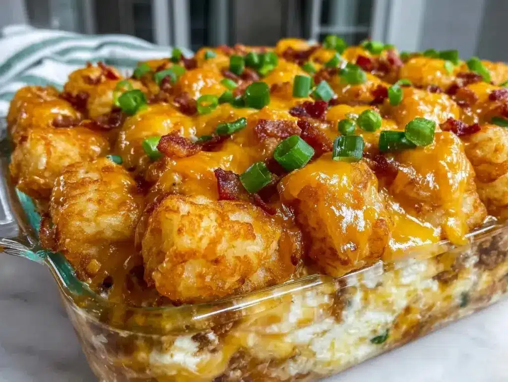 This easy make-ahead breakfast casserole features crispy tater tots, eggs, bacon, sausage, and gooey cheese for a crowd-pleasing brunch. Perfect for holidays, potlucks, or lazy weekends, it’s hearty, comforting, and endlessly customizable.
