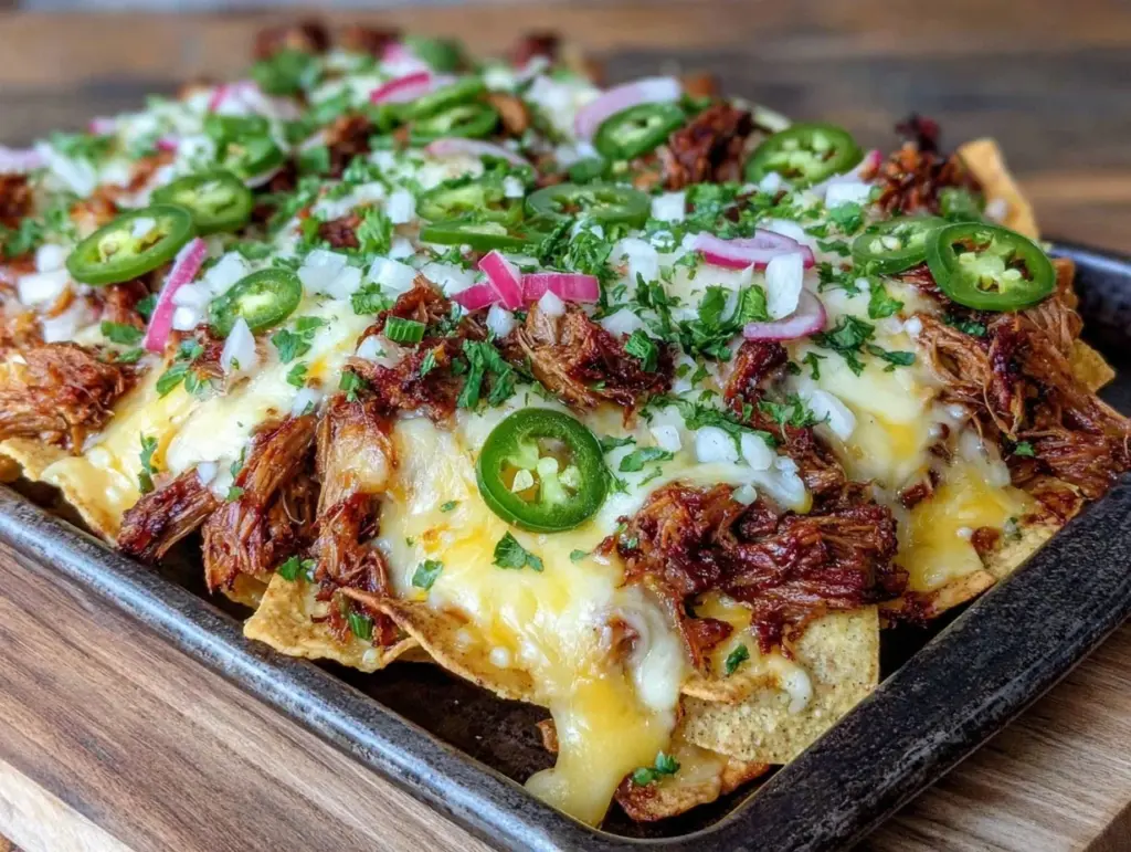 Keywords: carnitas nachos, sheet pan nachos, pickled red onion, easy nachos, Mexican snack, crowd-pleaser, quick nachos