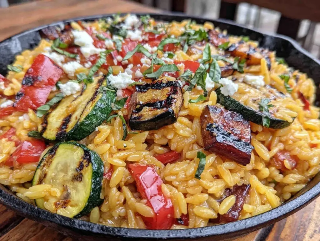 A quick and flavorful one-pan Mediterranean orzo dish with smoky grilled vegetables, fresh herbs, and a bright garlic-lemon finish. Perfect for busy weeknights or casual dinners.