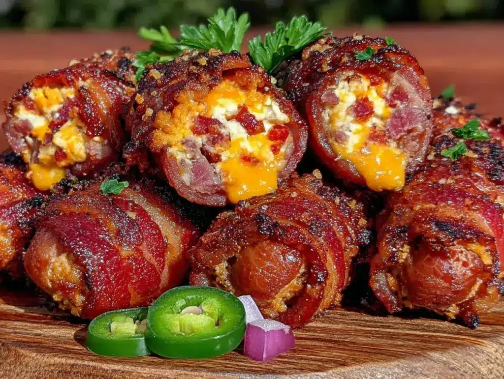 A bold and spicy recipe featuring hot dogs wrapped with stuffed jalapeños and crispy bacon, perfect for quick BBQs and game days.