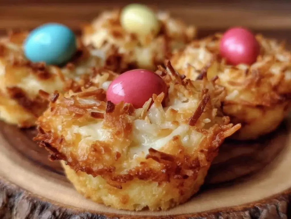 14. Add candy eggs: Carefully nestle 3-4 mini candy eggs in each coconut nest. Chill cupcakes briefly if frosting gets too soft.