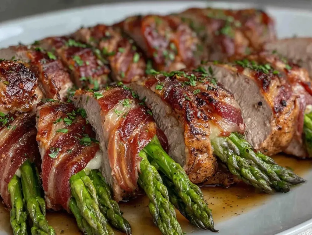 A juicy pork tenderloin stuffed with salty prosciutto and fresh asparagus, roasted to perfection for an elegant yet easy dinner.