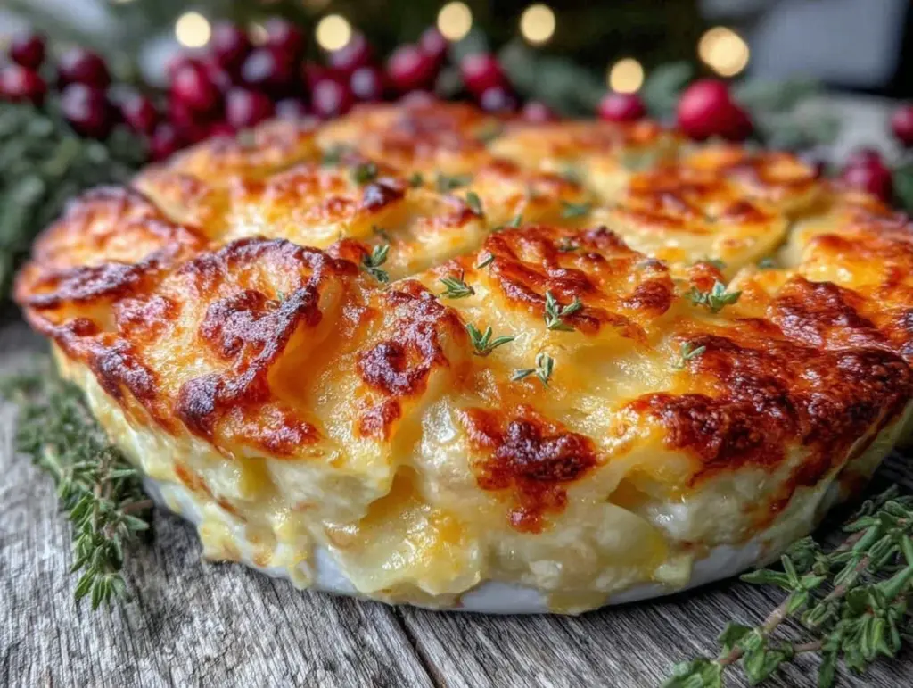 A cozy, creamy scalloped potato dish layered with nutty Gruyère cheese and a velvety cream sauce, perfect for Christmas dinners and holiday gatherings.